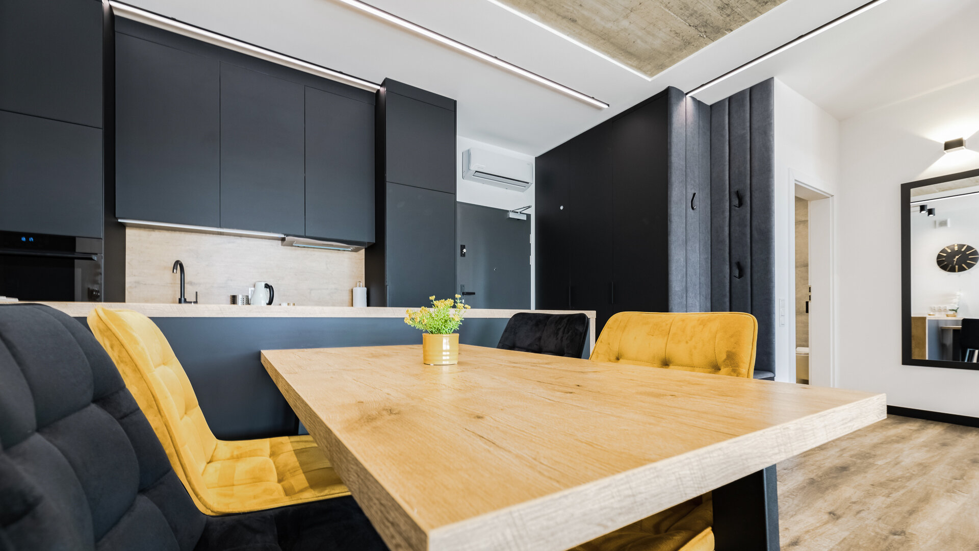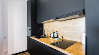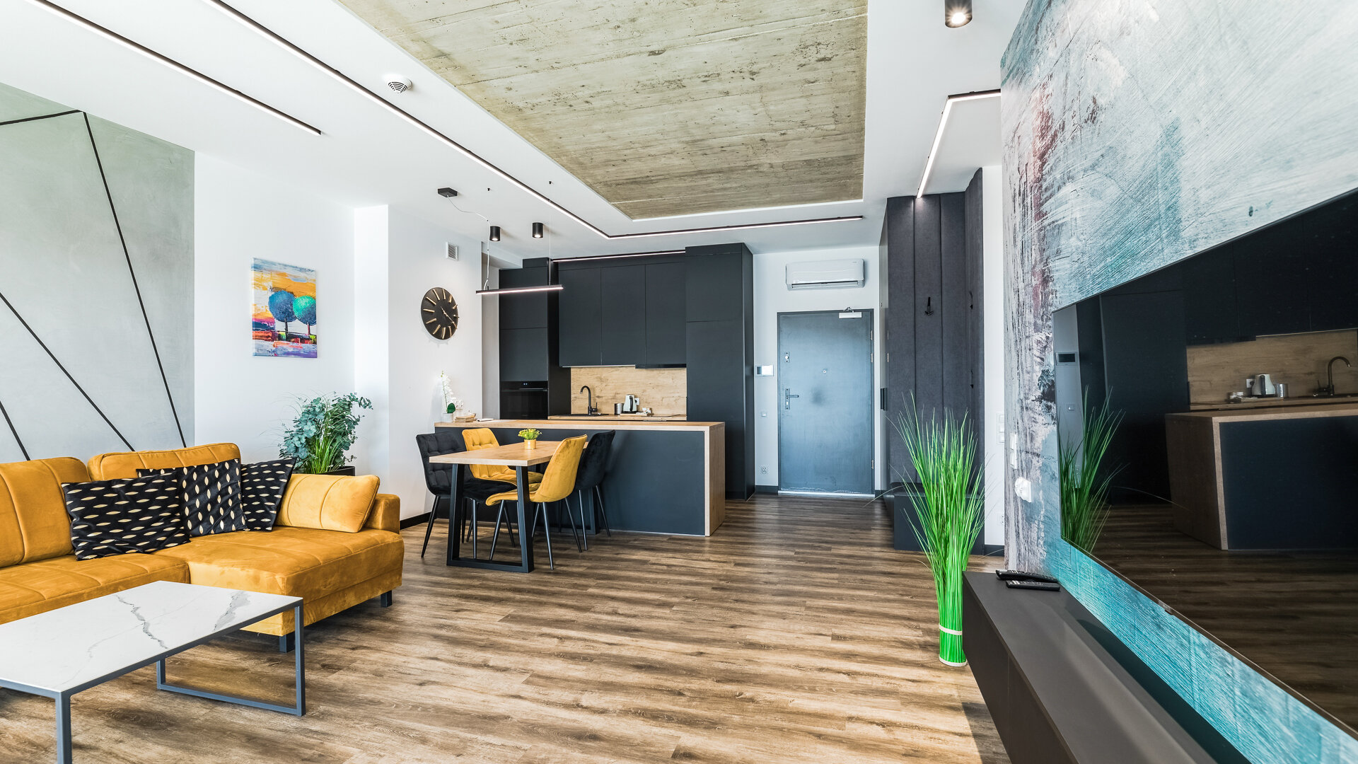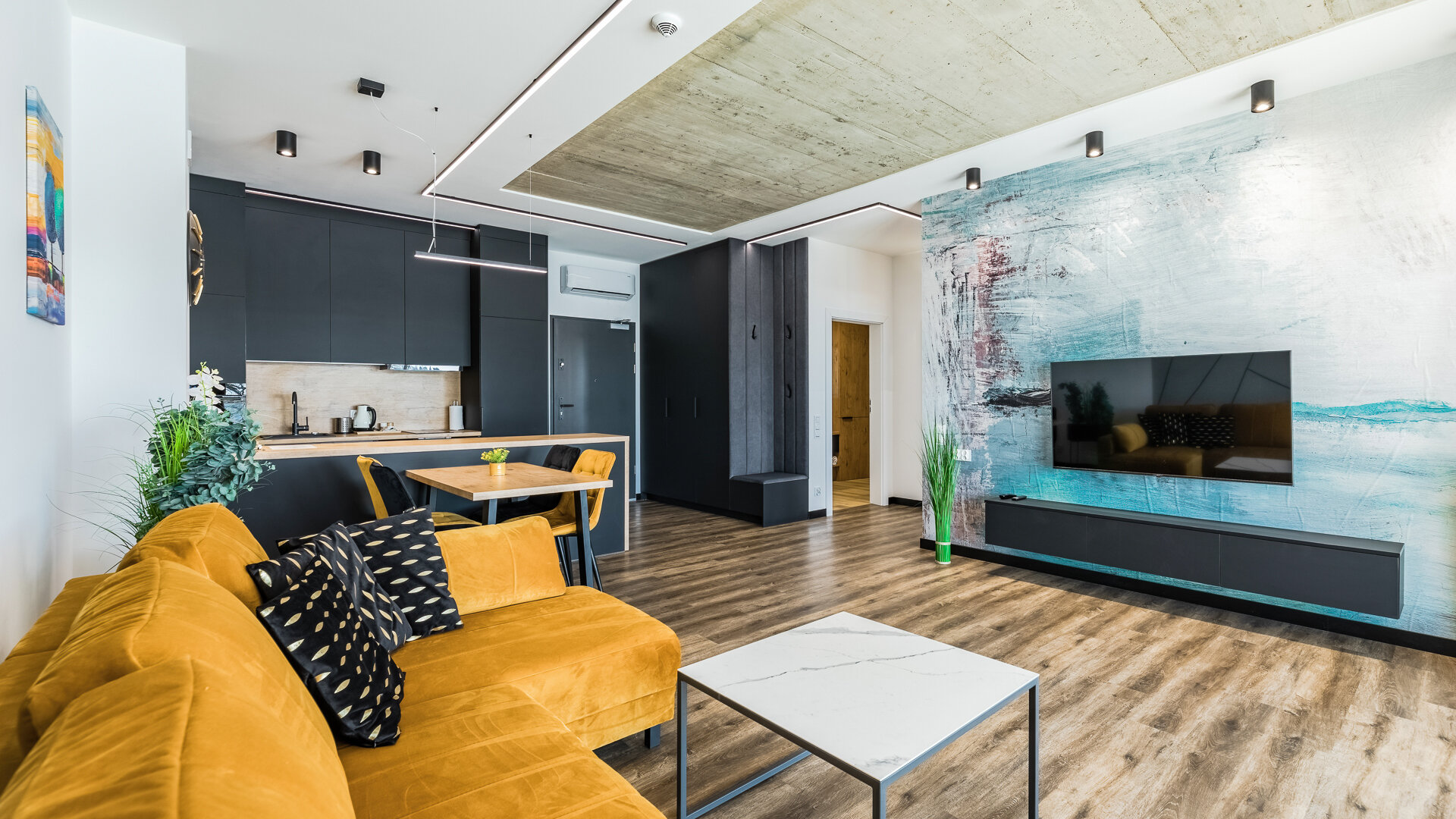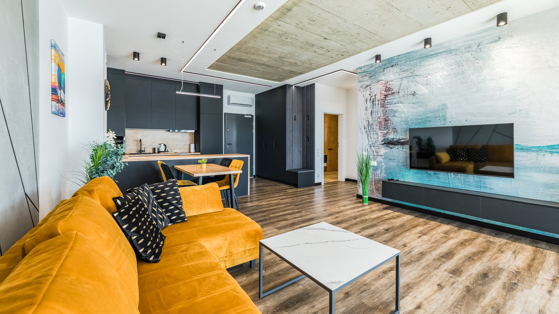 Apartament A205 Suite posiada duży i przestronny salon z aneksem kuchennym i rozkładaną sofę, sypialnię, łazienkę z prysznicem i duży zadaszony taras z meblami. Znajduje się na drugiej kondygnacji budynku.