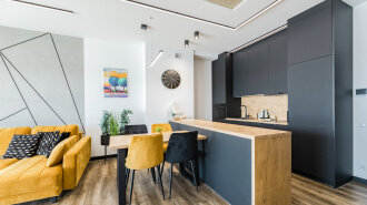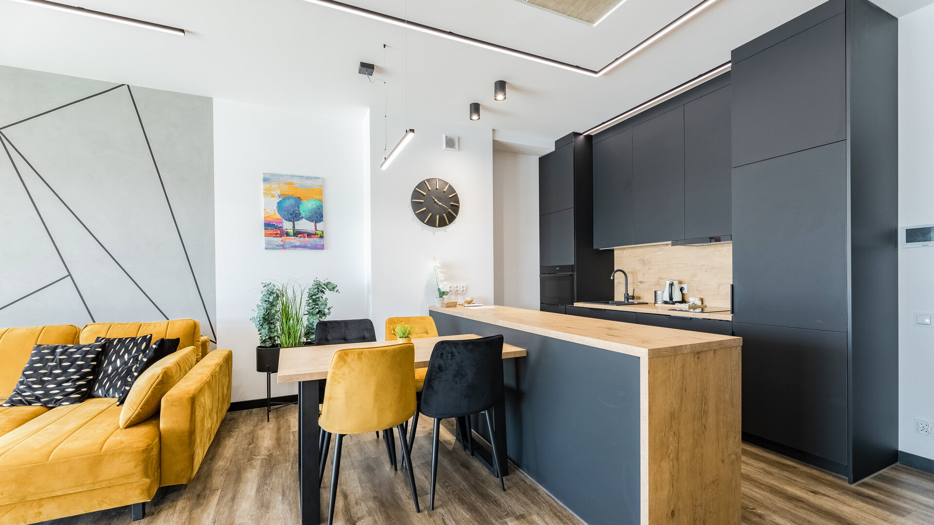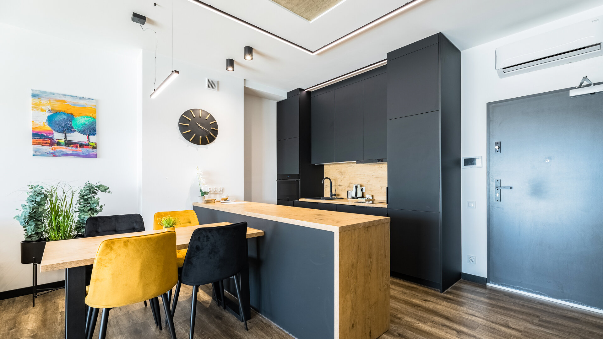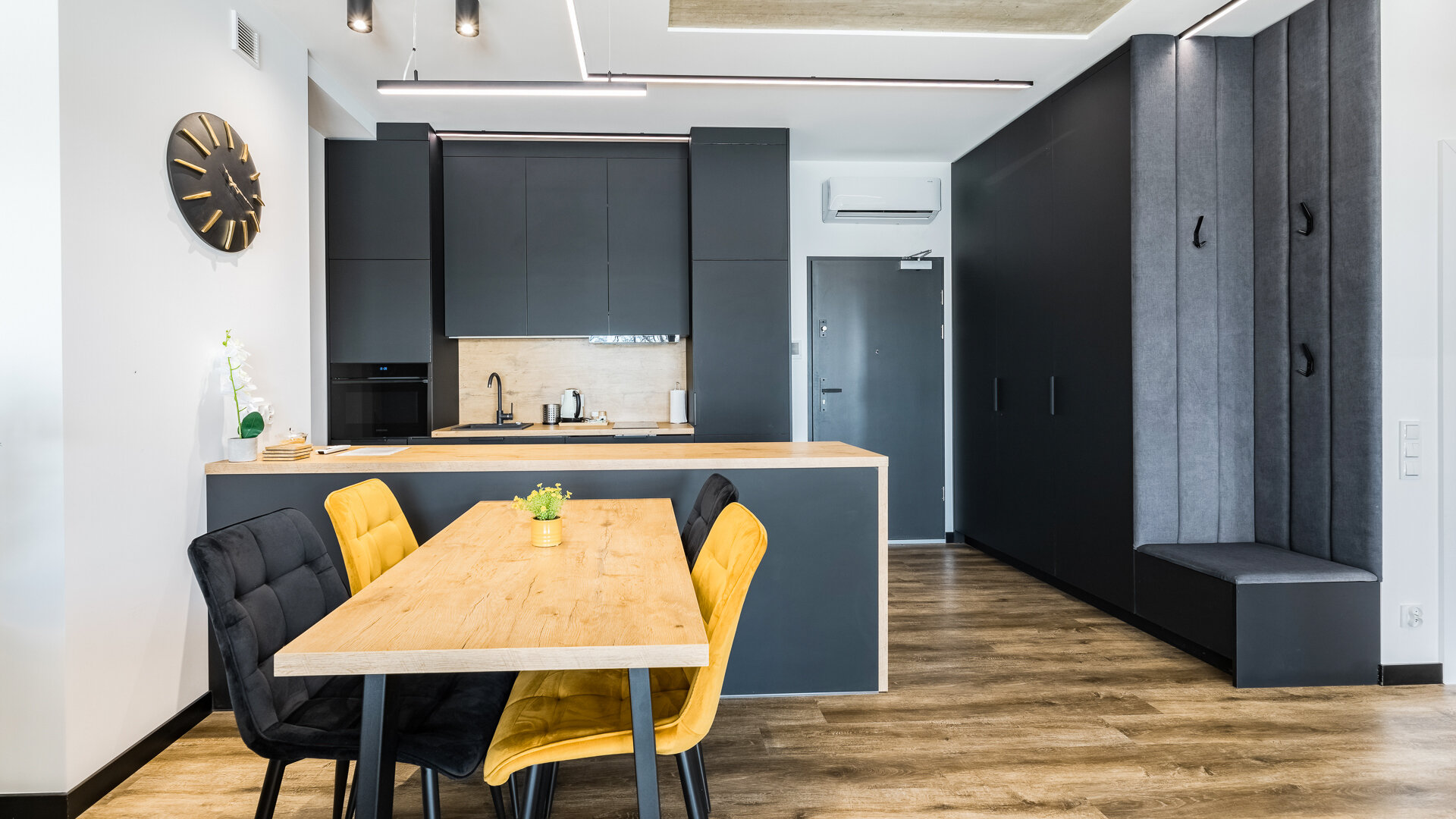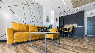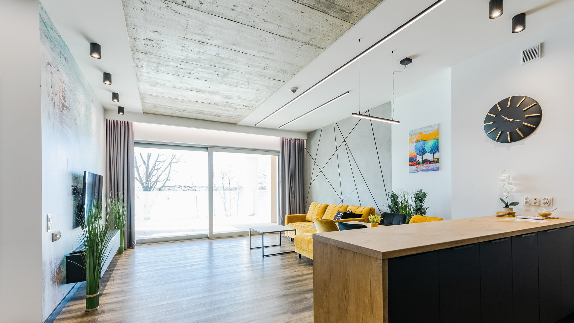 Apartament A205 Suite posiada duży i przestronny salon z aneksem kuchennym i rozkładaną sofę, sypialnię, łazienkę z prysznicem i duży zadaszony taras z meblami. Znajduje się na drugiej kondygnacji budynku.