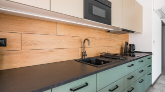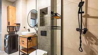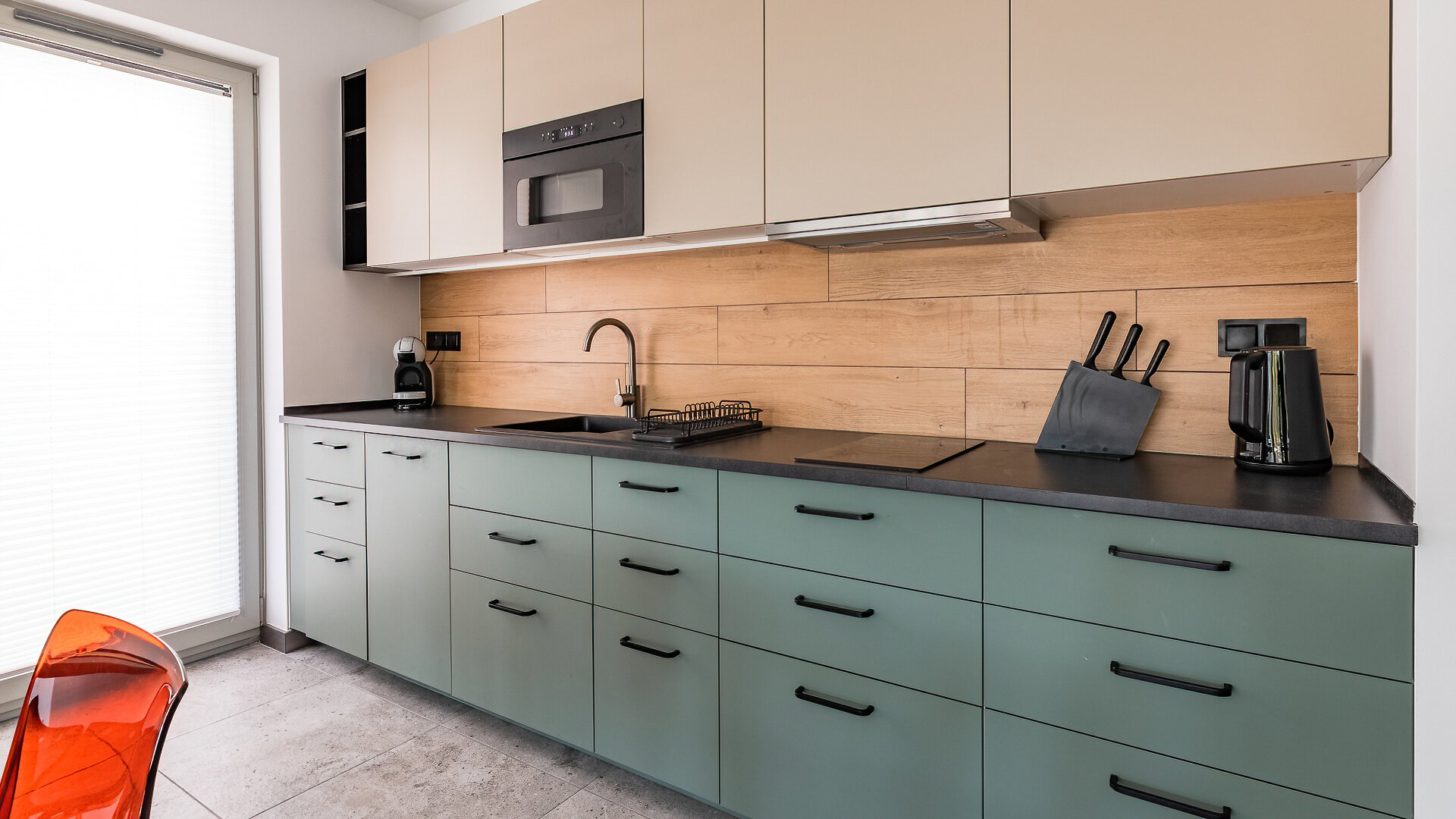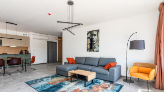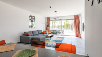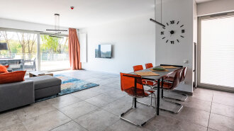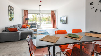 Apartament B106 Suite posiada duży i przestronny salon z aneksem kuchennym i rozkładaną sofę, dwie sypialnie, łazienkę z prysznicem i duży taras z meblami. Leży na parterze budynku B.