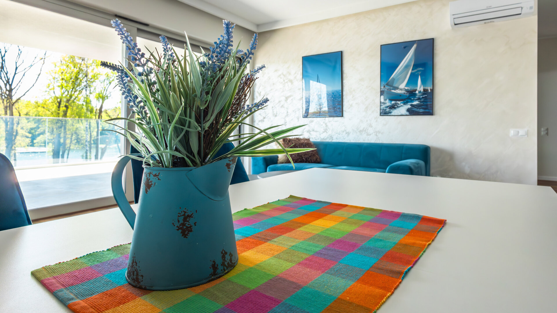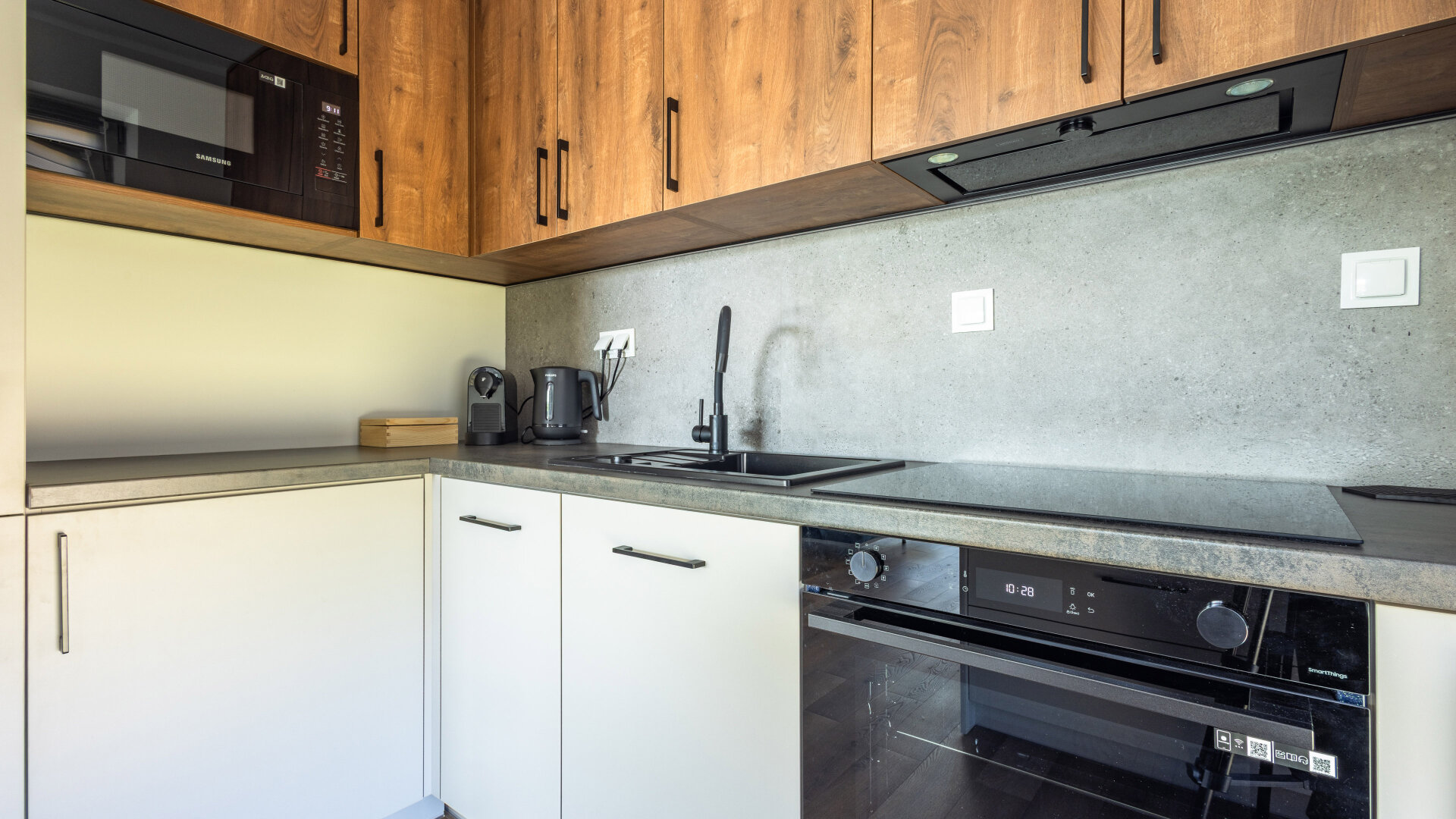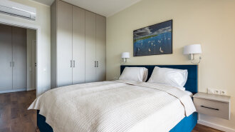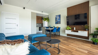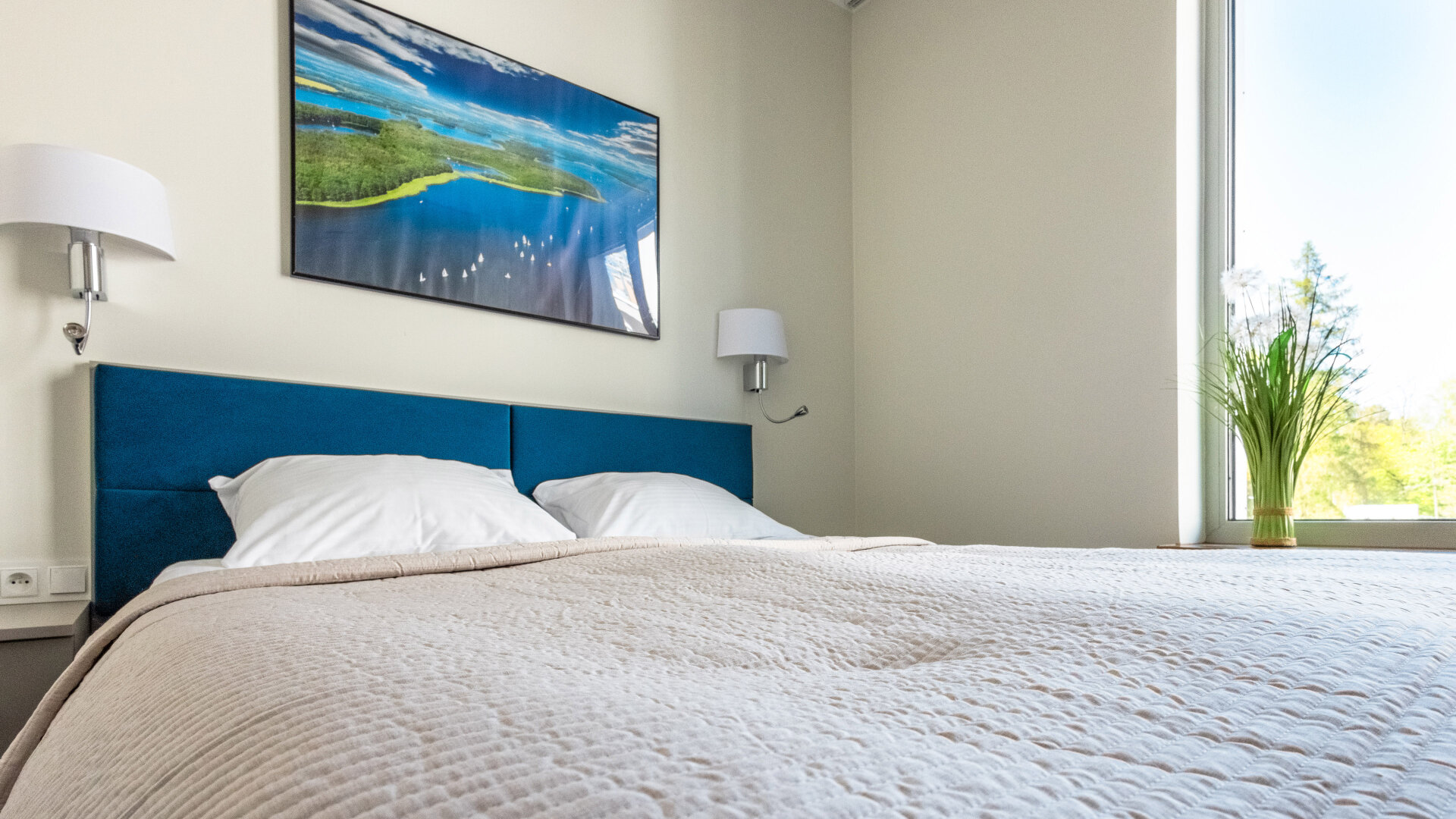 Apartament B201 Suite położony jest na pierwszym piętrze budynku B, posiada duży i przestronny salon z aneksem kuchennym, dwie sypialnie, dwie łazienki, jedna z prysznicem, druga z wanną, duży taras z widokiem na zatokę Tracz i jezioro Kisajno