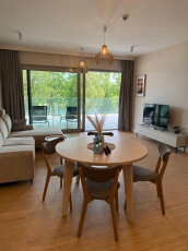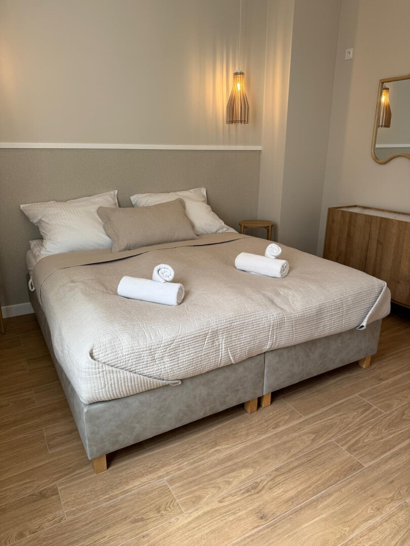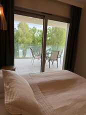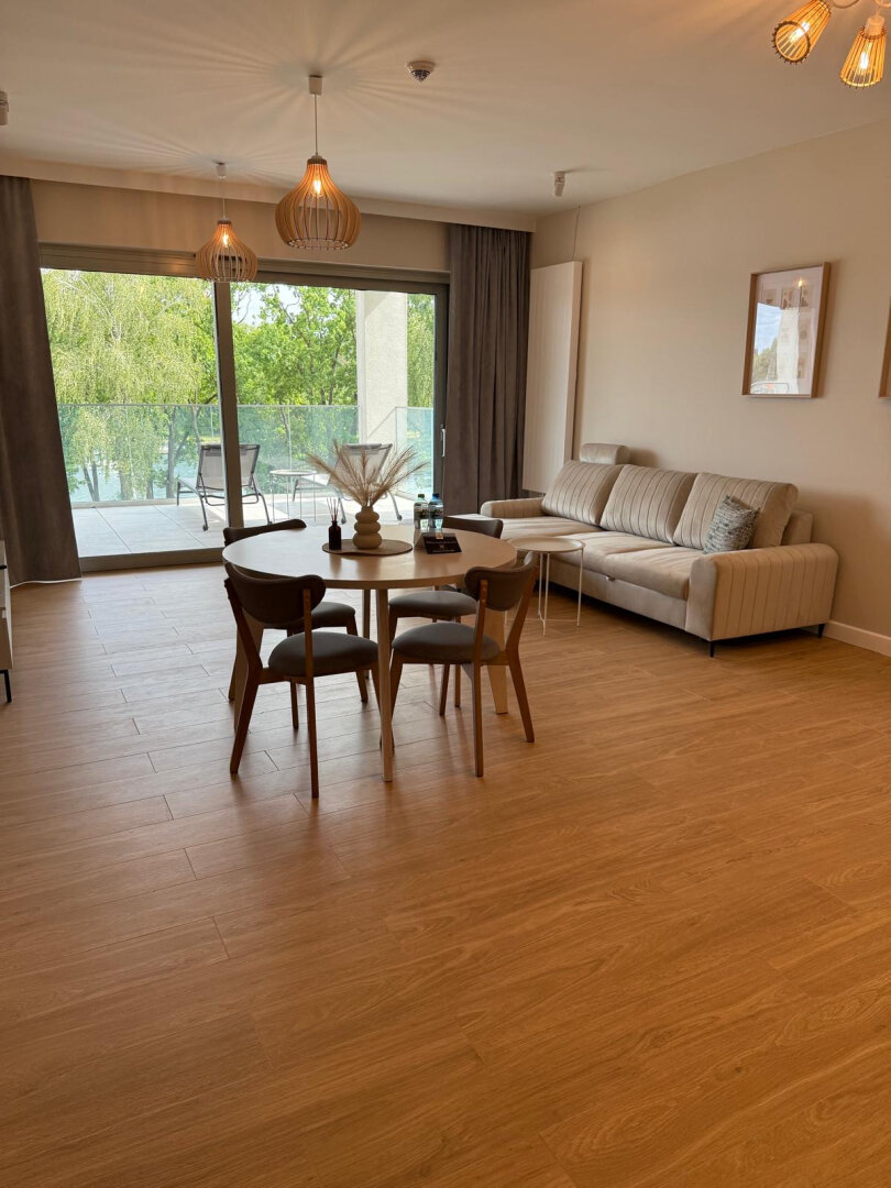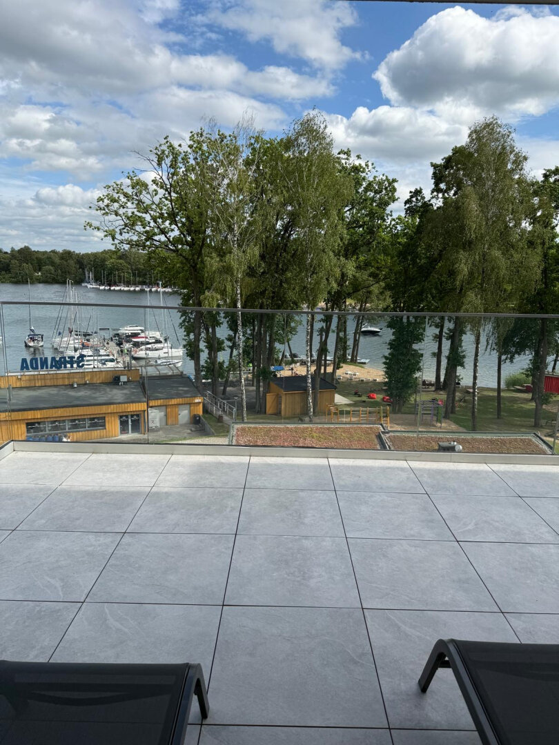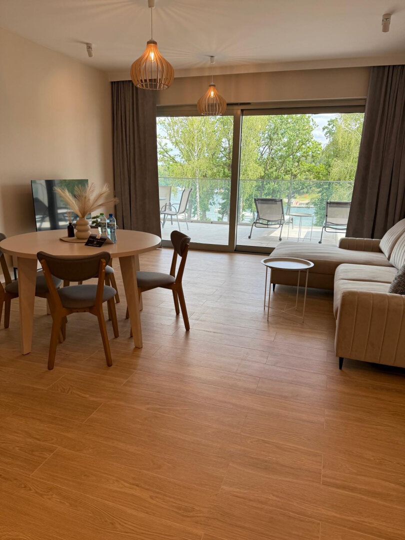 Apartamenty B305 z 1 sypialnią znajdują się w budynku B, w sypialni łóżko podwójne, salon z aneksem kuchennym z rozkładaną sofą dla 2 osób, łazienka z prysznicem i tarasem z pięknym widokiem na jezioro Kisajno.