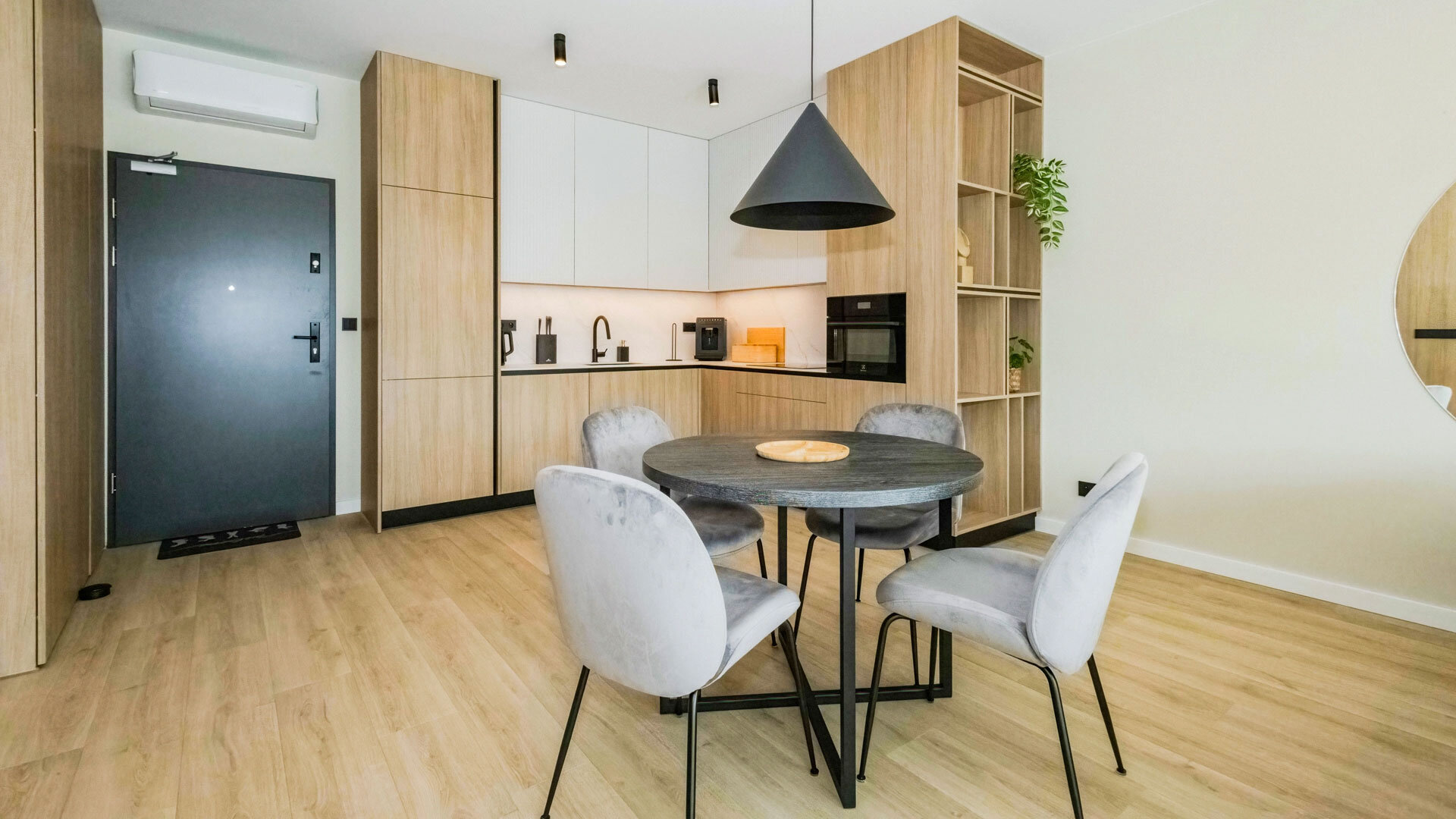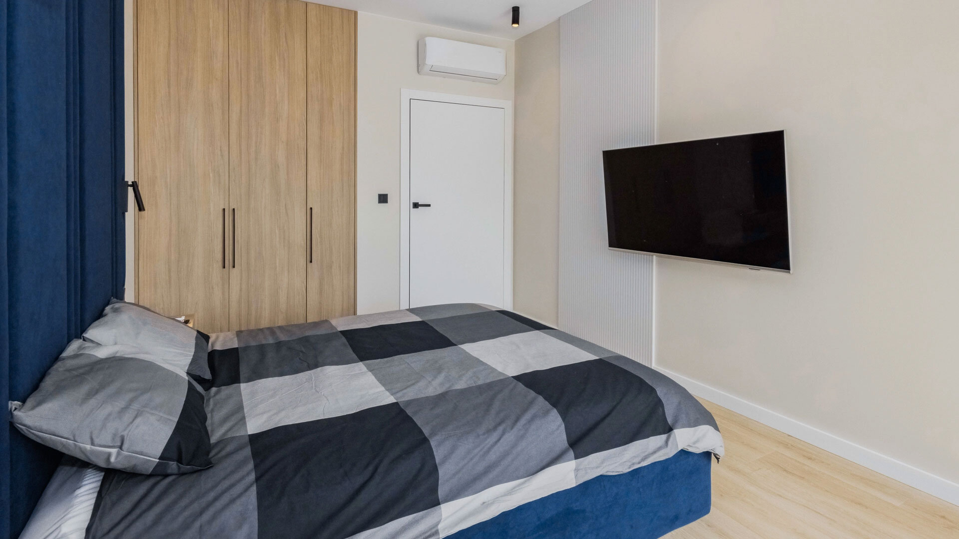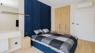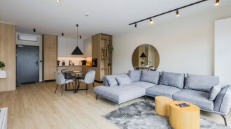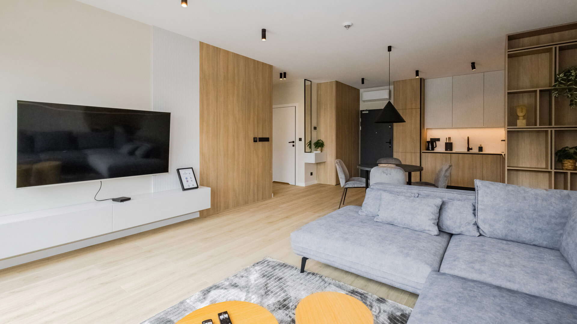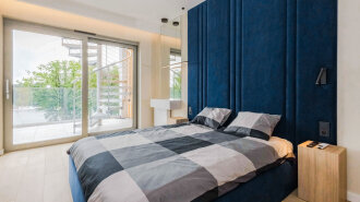 Apartament B404 Suite leży na trzecim piętrze budynku, posiada duży i przestronny salon z aneksem kuchennym i rozkładaną sofę, sypialnię, łazienkę z prysznicem, balkon i duży taras na dachu z widokiem na jezioro.