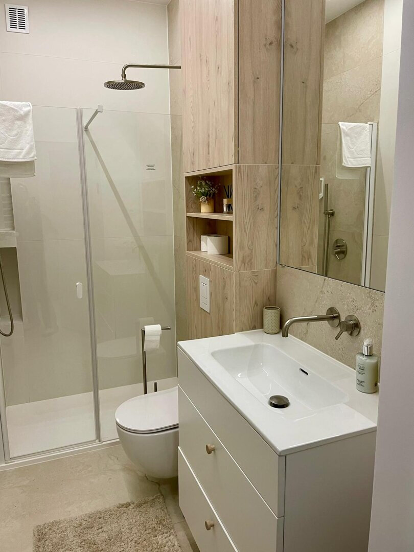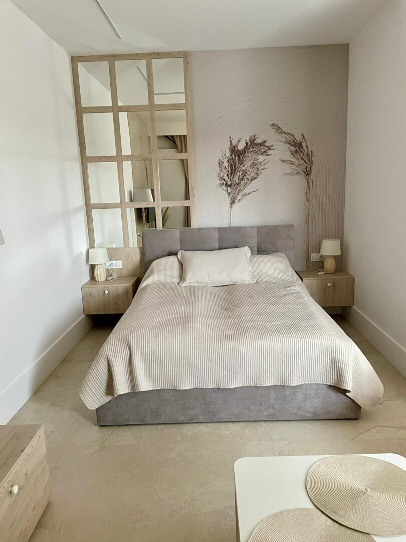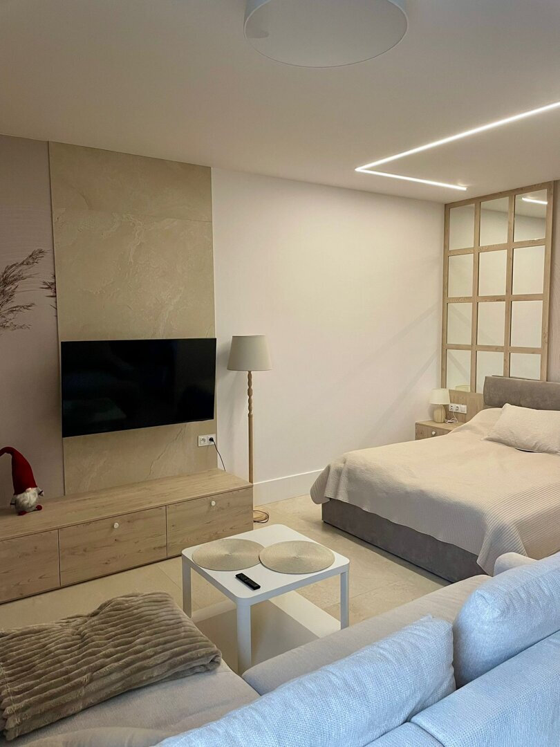 Apartament C402 typu Studio leży na najwyższym 3 piętrze budynku C, posiada wydzielone miejsce sypialniane z jednym łóżkiem podwójnym, salon z rozkładaną sofą, aneks kuchennym oraz łazienkę z prysznicem.