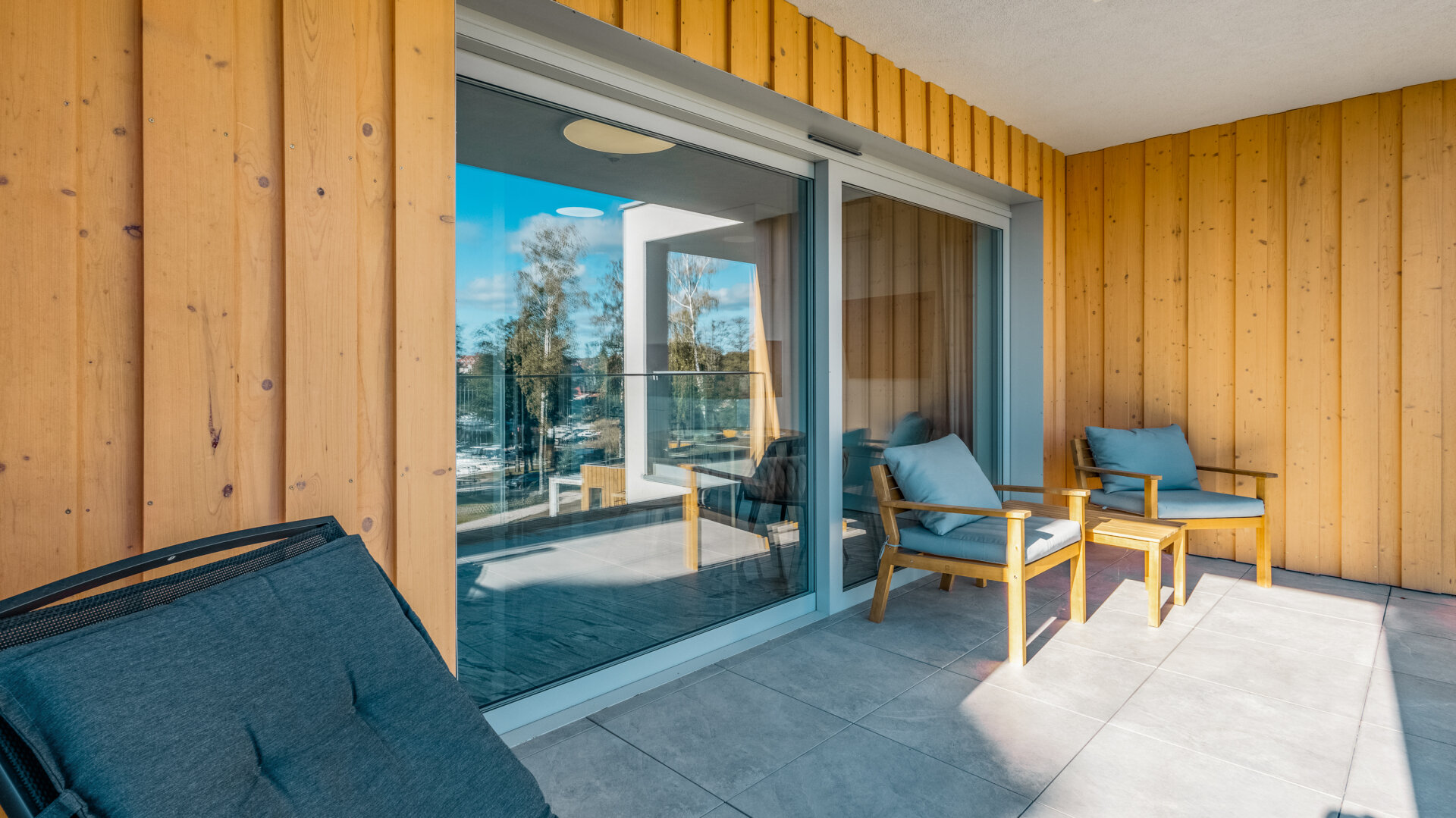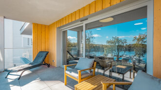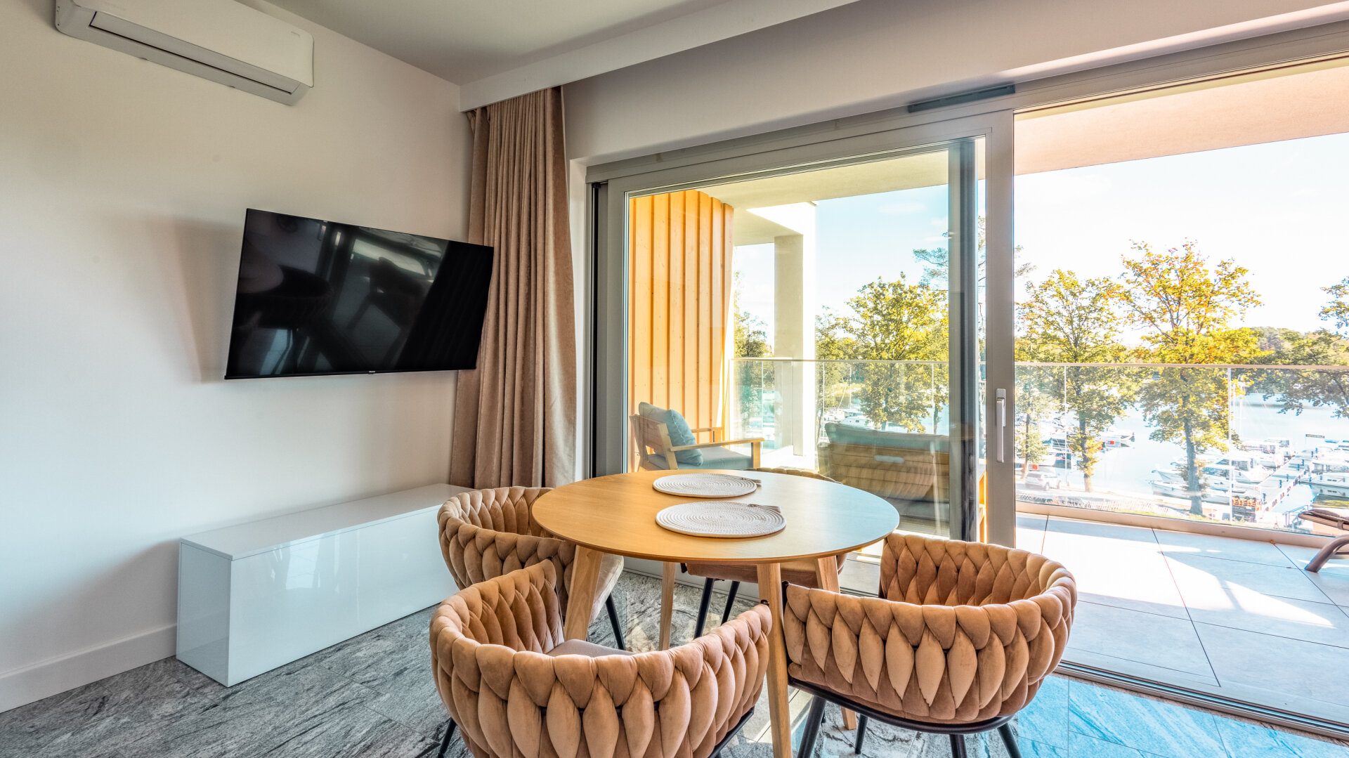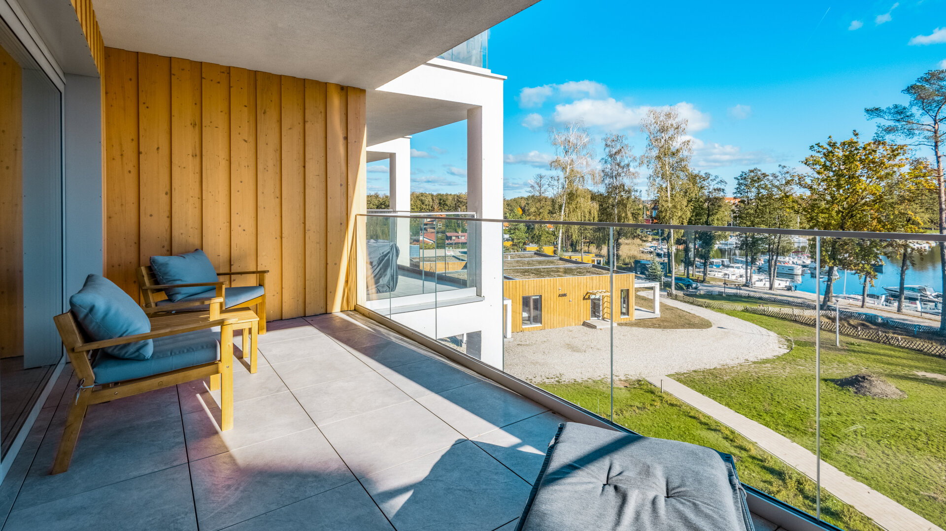 Apartament C304 Studio znajduje się na drugim piętrze budynku C, posiada miejsce noclegowe z łóżkiem podwójnym, rozkładaną sofę 2os., salon z aneksem kuchennym, łazienkę z prysznicem i taras z widokiem na zatokę Tracz i port Stranda. C304 Studio (maksymalna ilość osób 4).