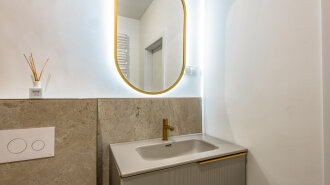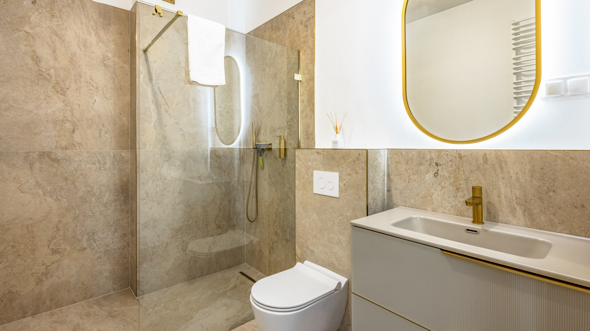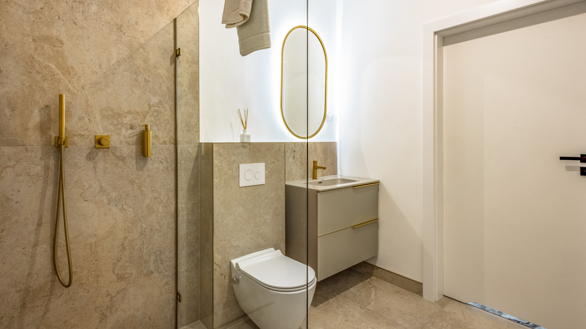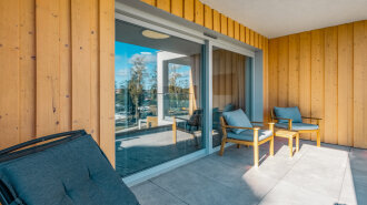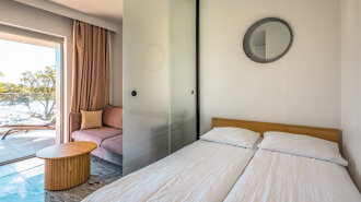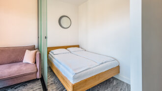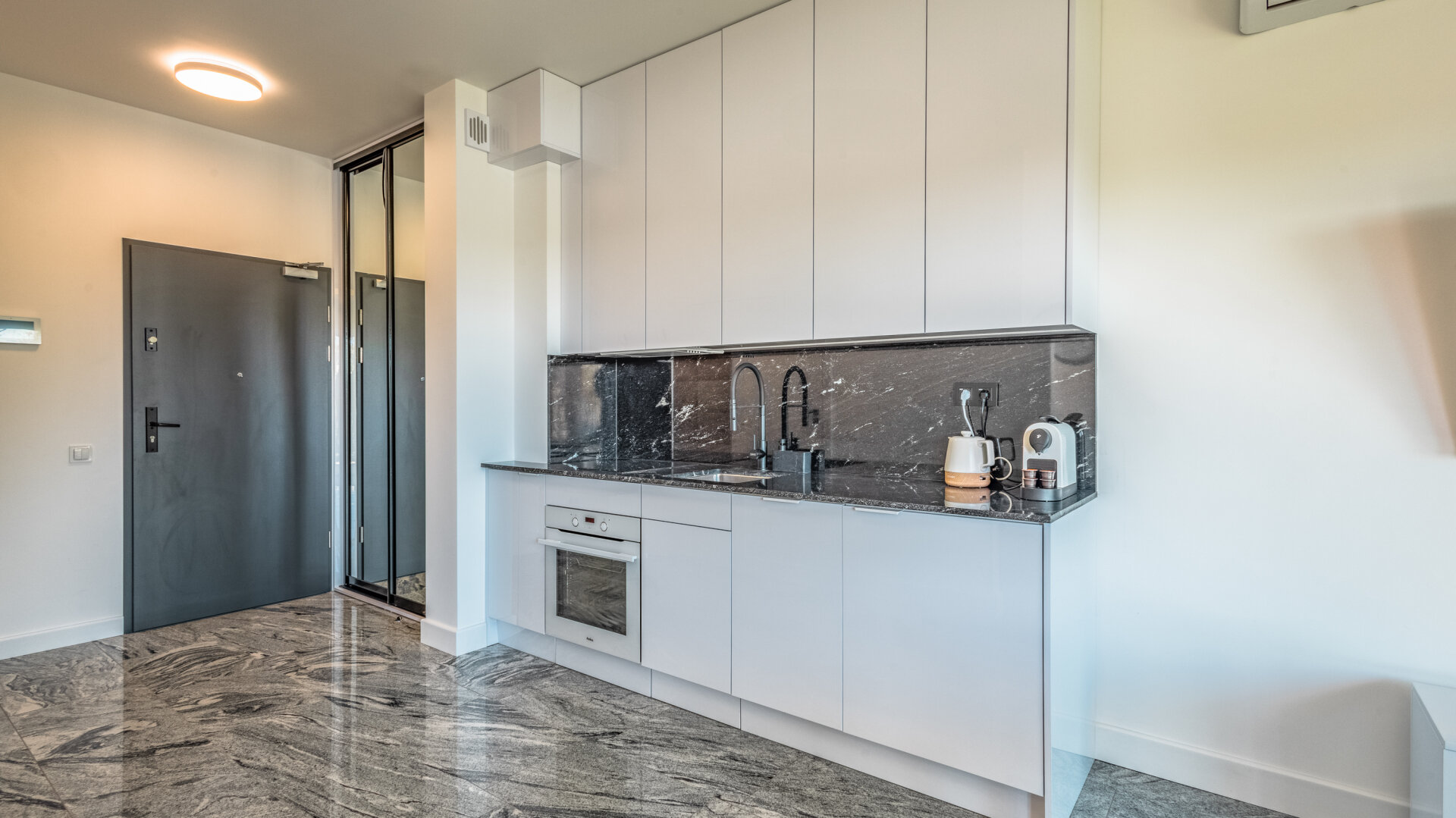 Apartament C304 Studio znajduje się na drugim piętrze budynku C, posiada miejsce noclegowe z łóżkiem podwójnym, rozkładaną sofę 2os., salon z aneksem kuchennym, łazienkę z prysznicem i taras z widokiem na zatokę Tracz i port Stranda. C304 Studio (maksymalna ilość osób 4).