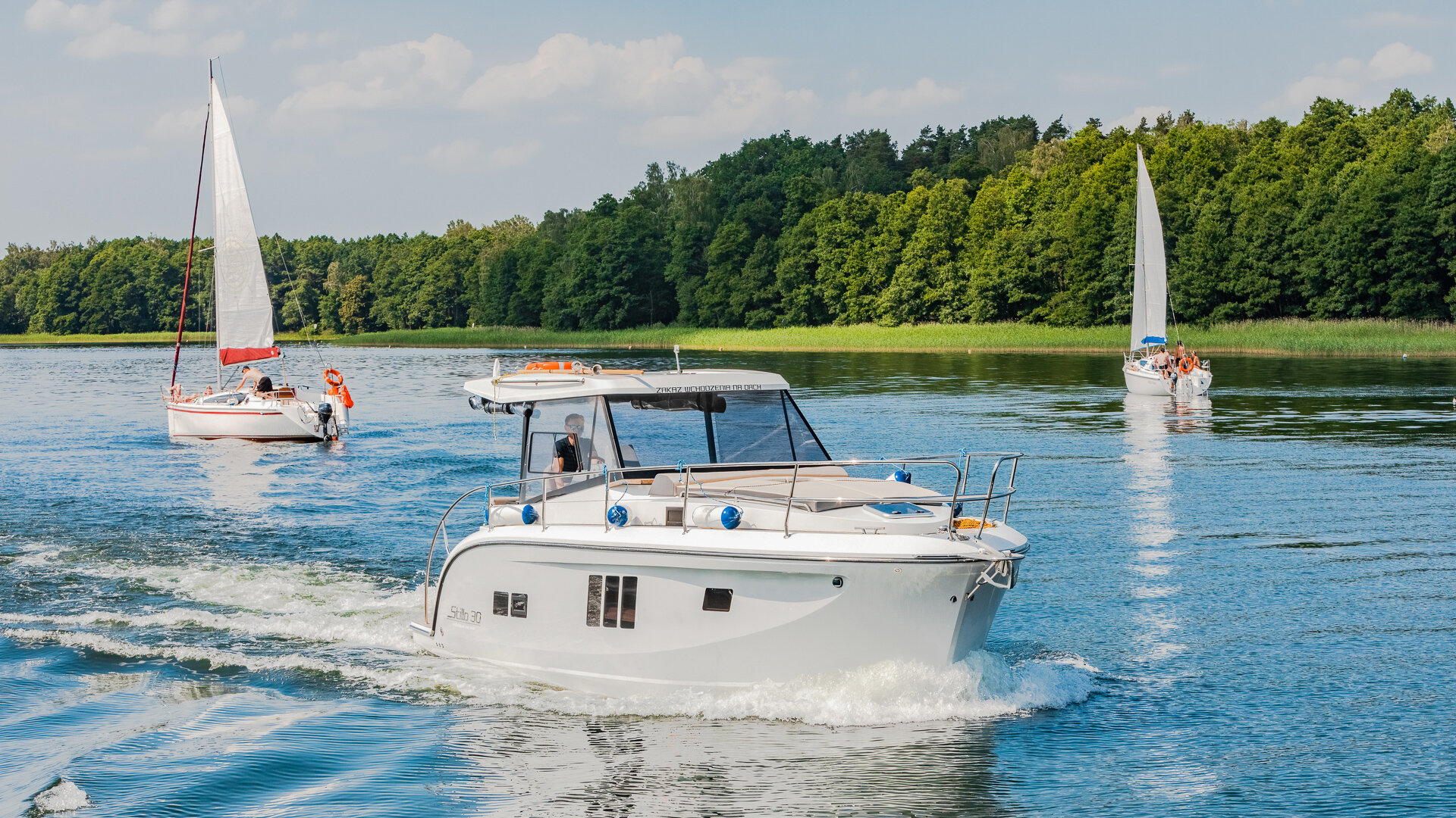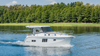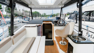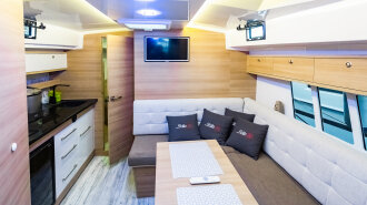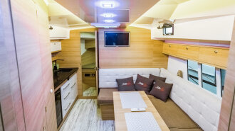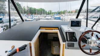 Podstawowe atuty to mocny silnik stacjonarny 52KM, dwa stery strumieniowe, elektryczna winda kotwiczna, materace z pianką termoplastyczną, WiFi bez ograniczeń, TV z Netflix, HBO Max, ekspres do kawy Nespresso i wiele innych...